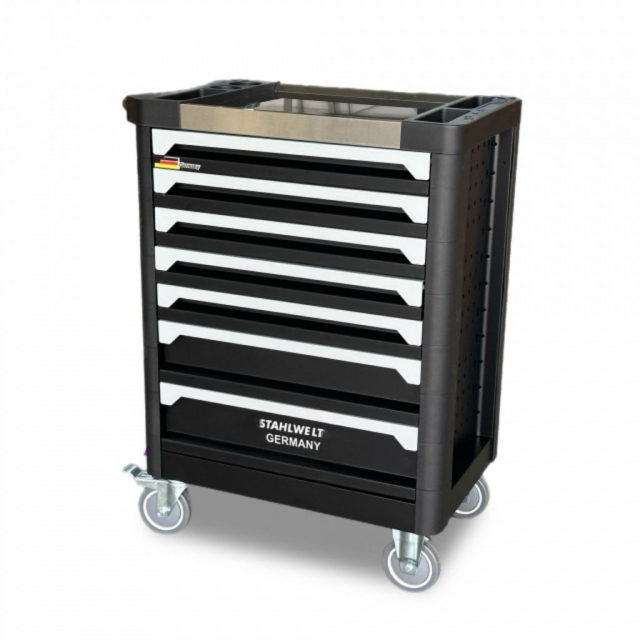 Der Werkzeugwagen STW7 von Stahlwelt Germany ist eine robuste und vielseitige Lösung zur Organisation und Aufbewahrung von Werkzeugen. Dieser Wagen ist mit 7 kugelgelagerten Schubladen ausgestattet, von denen 6 vollständig mit hochwertigen Werkzeugen gefüllt sind. Die Schubladen sind mit stabilen Moosgummimodulen ausgestattet, die die Werkzeuge optimal vor Beschädigung und Abnutzung schützen.